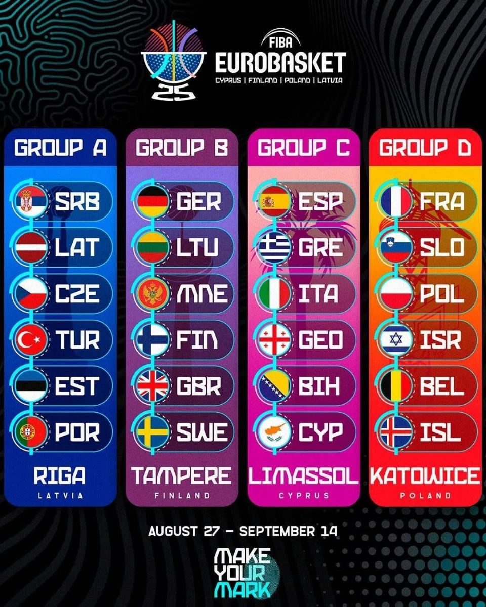 欧洲杯又称男篮欧锦赛,一共24支球队参赛,分成四个小组,每组的前四名晋级16强。本届欧洲杯分组如下: