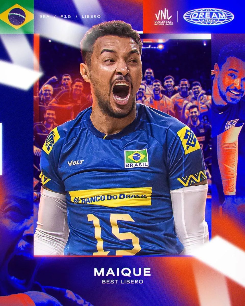 即便如此,迈克选择以表现作答,证明自己。在2025年VNL世界联赛中,他以绝对主力自由人的身份出战,全勤参加巴西男排全部比赛,帮助球队拿下铜牌,并荣膺赛事最佳自由人。他在一传起球、后排防守与防反衔接上的高效与稳定,以总防守249次,成功119次,防守成功率47.79%排名防守榜第一,是巴西能够重回领奖台的重要基石。